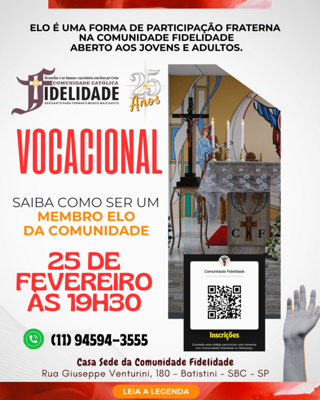 Convite – Encontro Vocacional dos ELOS Você é nosso convidado para o Encontro Vocacional dos ELOS, um momento especial de escuta, discernimento e aprofundamento no chamado que Deus faz a cada um de nós dentro da Comunidade Fidelidade. 📅 Data: 25 de fevereiro⏰ Horário: 19h30📍 Local: Sede da Comunidade Fidelidade Será uma noite de oração,…