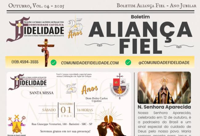 📰✨ Boletim Aliança Fiel – Outubro ✨📰 O Boletim Aliança Fiel do mês de outubro já está disponível! Este é um espaço de comunhão e formação para todos os membros da Comunidade Católica Fidelidade e para todos que desejam caminhar conosco na fé. Neste mês, em que celebramos Nossa Senhora Aparecida, padroeira do Brasil, renovamos…
