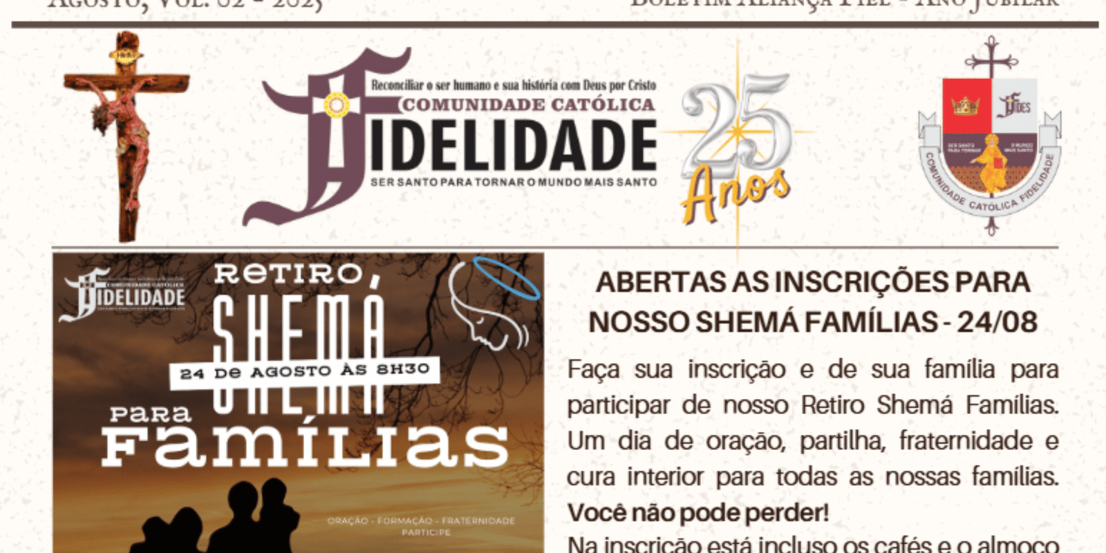 ago72025Artigos BoletimAgostoBaixar 07/08/2025 Compartilhe Share on WhatsAppShare on WhatsApp Share on FacebookShare on Facebook Share on XShare on X Navegação de post:AnteriorPost anterior:Tarde de Cura Interior 21/09 – 15h00PróximoPróximo post:Roteiro da semana: De 18 a 22 de agosto 2025Related PostsSanta Teresa D’Ávila – Baluarte da Comunidade Fidelidade14/10/2025Boletim Aliança Fiel – Outubro 202501/10/2025Nossa Senhora do Rosário, o meio de alcançar almas para Deus01/10/2025Leão XIV: Terço pela paz na Praça São Pedro, em 11 de outubro01/10/2025Dom Pedro Carlos Cipollini: quinze anos de episcopado01/10/2025Dia de Nossa Senhora das Mercês24/09/2025
