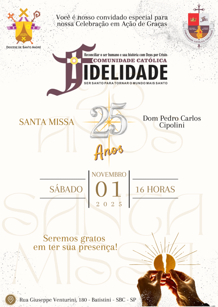 A Comunidade Católica Fidelidade completa 25 anos de caminhada e, com o coração cheio de gratidão, queremos celebrar juntos tudo o que o Senhor realizou em nossa história.